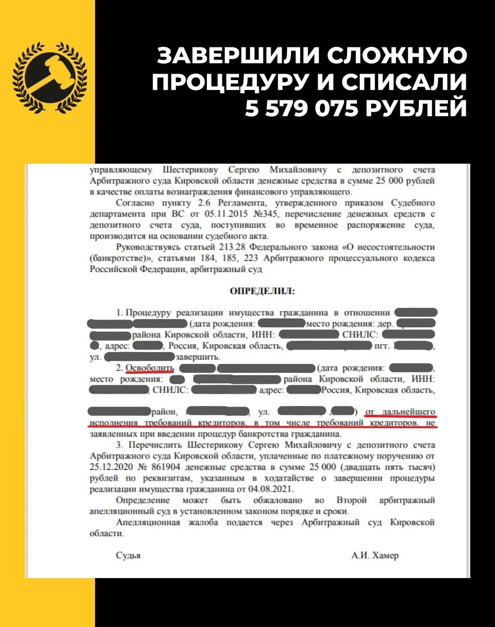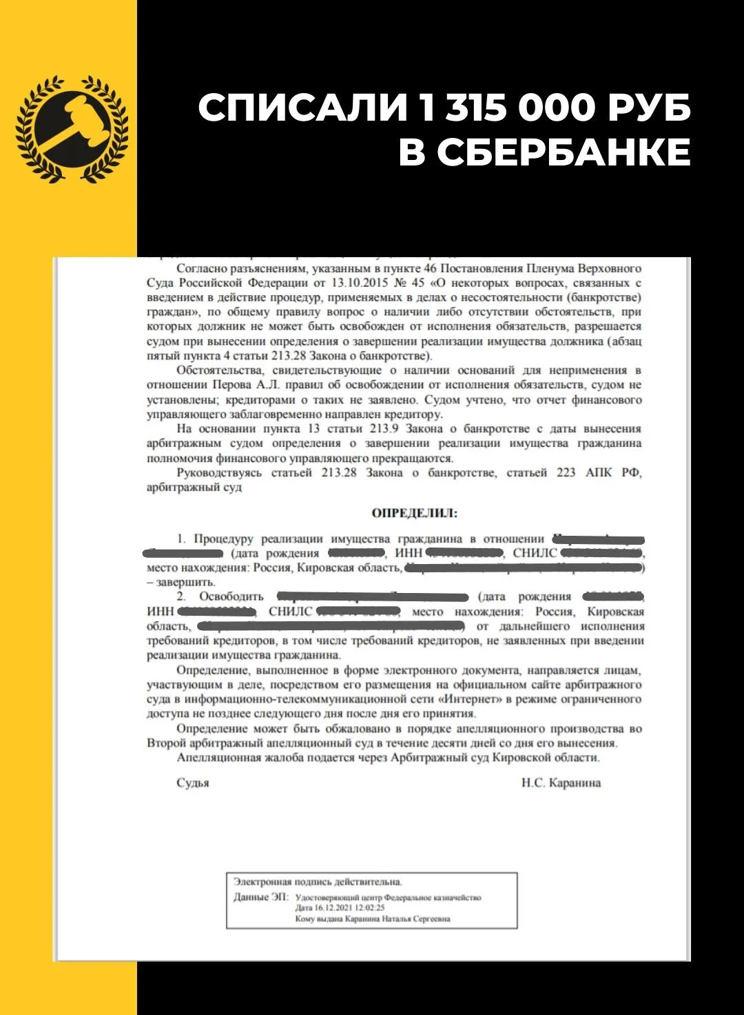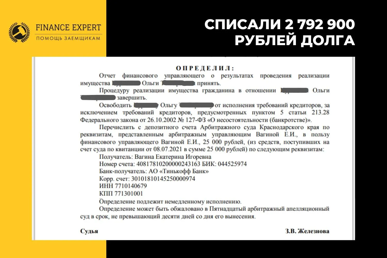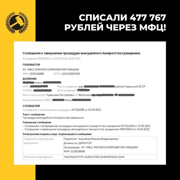 Условия для проведения процедуры банкротства и списания долгов одинаково действуют во всех регионах страны. Ниже делимся результатами клиентов федеральной юридической компании «Помощь заёмщикам | Finance Expert», которые смогли избавиться от крупных долгов благодаря своевременным действиям и грамотной работе юристов.