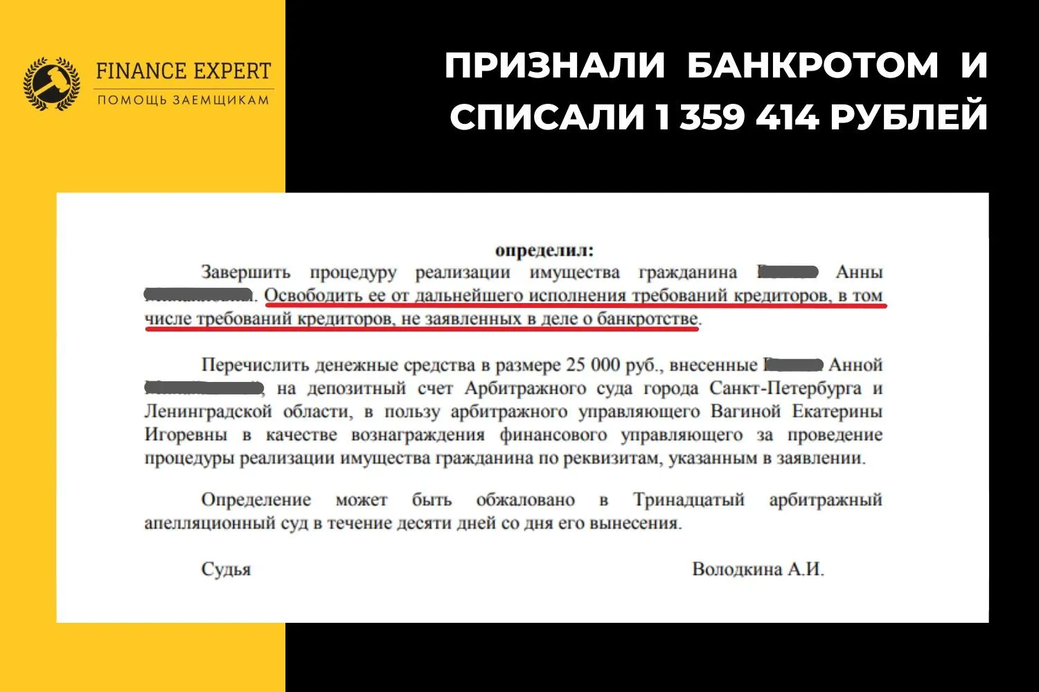 Вы тоже можете обратиться за помощью и уже на первой бесплатной консультации с юристами «Finance Expert» узнать свои шансы на списание долгов.
