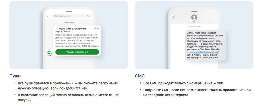- Выбором формата. Клиент может выбрать комфортный способ получения уведомлений: СМС или с помощью пушей. Во втором случае сообщения будут приходить только при подключении смартфона к интернету и установленном приложении от банка. СМС можно пользоваться без установки программы и стабильного подключения к онлайн-сетям.