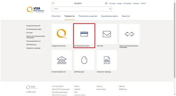 - Откроется окно, где выбираем пункт «Перевести», а затем «На счет Qiwi».