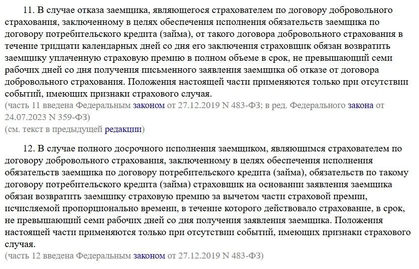 От страховки, оформленной в рамках получения потребительского кредита, можно отказаться в течение 30 дней с момента подписания договора со СК. Это право описано в Федеральном законе № 353-ФЗ «О потребительском кредите (займе). Еще отказ возможен можно при досрочном погашении кредитных обязательств.