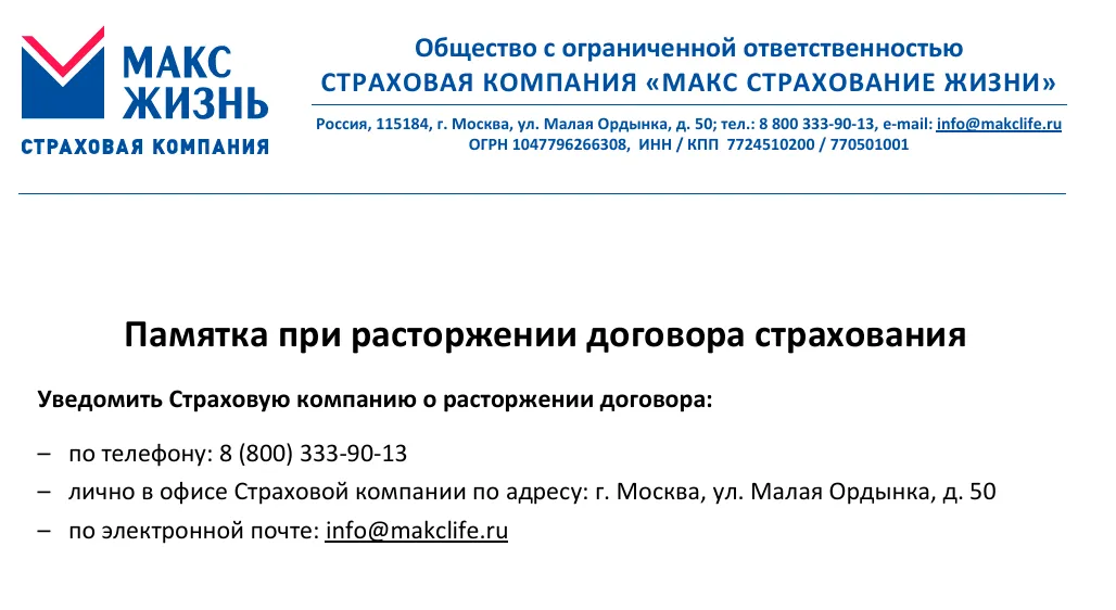 - Памятка по расторжению договора страхования. МАКС-Жизнь. Дата обращения: 09 января 2025 года.