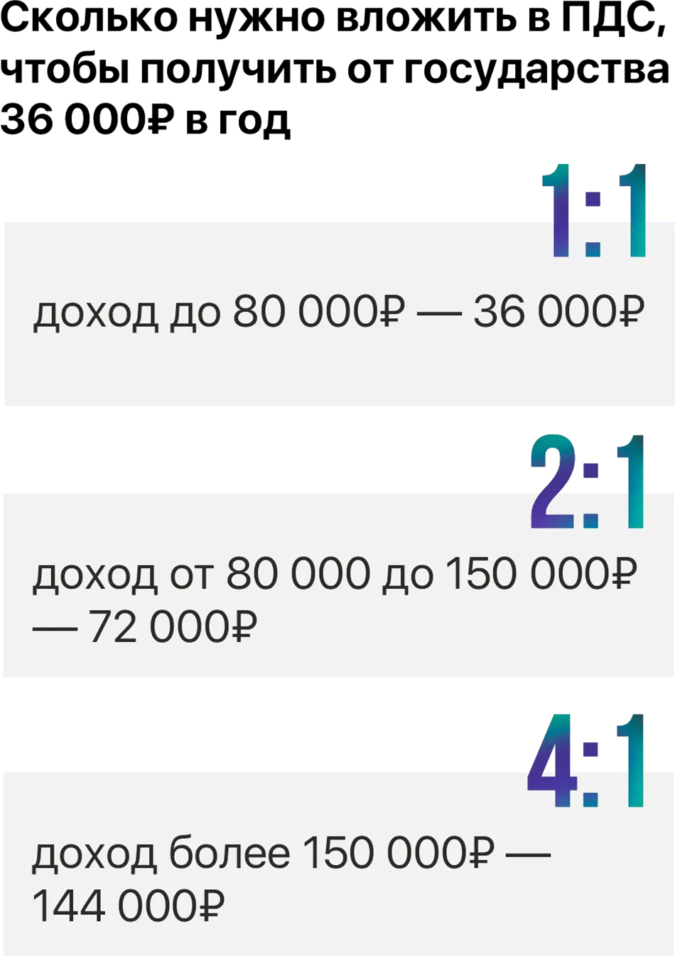 Это консервативные инвестиции, за сохранность средств можно не переживать, деньги застрахованы. Доходность при этом очень высокая — за счет софинансирования сбережений от государства. ПДС запущена в негосударственных пенсионных фондах: вы открываете счет, вносите туда деньги, из бюджета на ваш счет добавляют до 36 000 рублей в год. Плюс можно перевести свою накопительную пенсию. Софинансирование продлится 10 лет. Программа рассчитана на 15 лет или до достижения возраста 55 лет для женщин и 60 лет для мужчин (в зависимости от того, что наступит раньше).