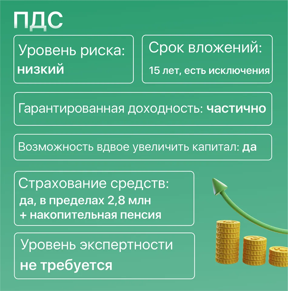 Этот финансовый инструмент работает с 2024 года. Реализуется через негосударственные пенсионные фонды, главная фишка: вклады софинансирует государство. Способ подходит тем, кто хочет получить высокую доходность, не рискуя и не вникая во все тонкости инвестирования.