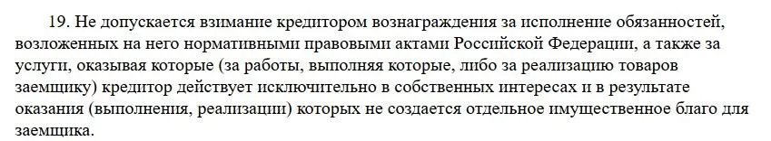 Полномочия и обязанности микрофинансовых организаций описаны в Федеральном законе №151 от 2 июля 2010 года, Федеральном законе №353 от 21 декабря 2012 года. Согласно законодательным актам, кредиторы не могут удерживать средства за услуги, оказываемые в собственных интересах.