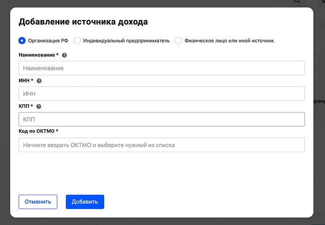 Если источников несколько, добавление происходит отдельно по каждой компании. Указывается полное название организации, ИНН, КПП и код по ОКТМО.