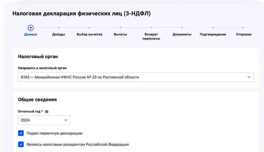 Иван переходит к заполнению стандартной формы, где нужно выбрать отчетный год.