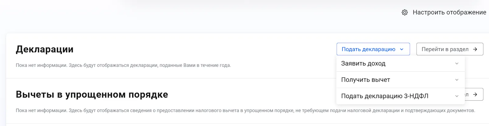 Еще один вариант, как получить вычет за квартиру – заполнить декларацию 3-НДФЛ. Это не самый простой способ и его рационально выбирать в случае, если нужно заявить одновременно о нескольких компенсациях. Например, внести сведения о дорогостоящем лечении или пройденном обучении. Функционал доступен в личном кабинете налогоплательщика по ссылке. В нижней части страницы нужно выбрать нужную строку и кликнуть на «Получить вычет».