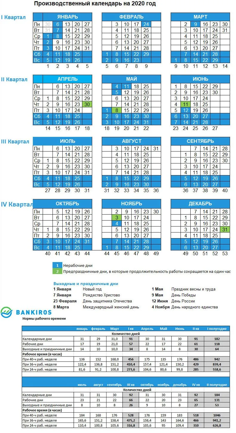 Производственный календарь в 2020 при пятидневной рабочей неделе