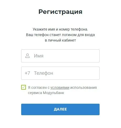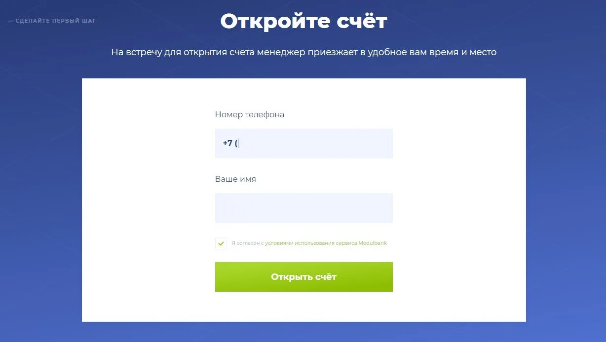 - Система автоматически перекинет на официальный сайт Модульбанка, где нужно ввести номер телефона для связи и нажать кнопку «отправить».