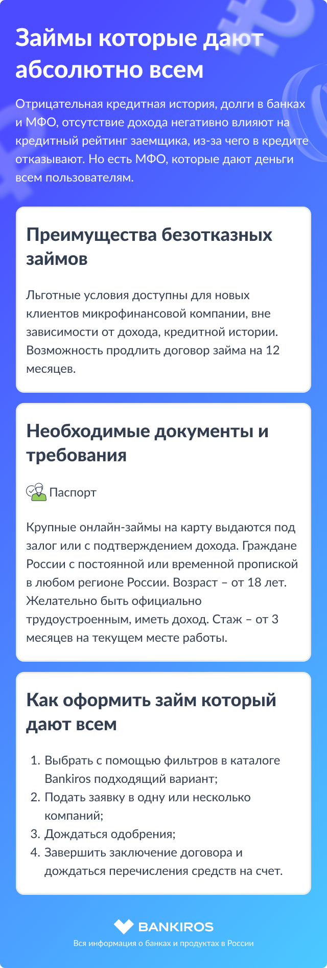 Отрицательная кредитная история, долги в банках и МФО, отсутствие дохода негативно влияют на кредитный рейтинг заемщика, из-за чего в кредите отказывают. Но есть МФО, которые дают деньги всем пользователям, соответствующим требованиям. На сайте Bankiros.ru представлены выгодные онлайн-займы для всех, кто соответствует критериям кредиторов.
