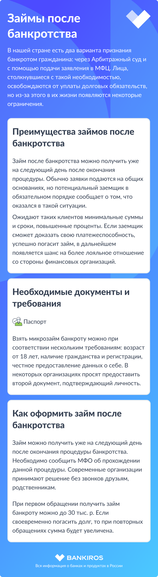 Если обращаются за займом, МФО обязательно проверят и кредитную историю потенциальных заемщиков, и с большой вероятностью реестр судебных приставов: независимо от того, признан банкротом человек или нет. Они обязаны это делать, поэтому после процедуры банкротства до обращения в МФО и банки для получения новых займов обязательно убедитесь в том, что вас убрали из любых долговых списков (чаще всего долги погашаются имуществом должника). Если вы все еще в перечне, обратитесь в соответствующие службы, которые предоставляют сведения, иначе взять займы не получится.