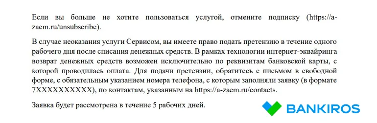 Оплата может осуществляться авансовым методом, поэтому при длительной работе опции возможны значительные и незапланированные расходы. Инициатива отписки от A-Zaem должна исходить от пользователя, поскольку сама система будет продлевать соглашение после истечения срока действия договора.