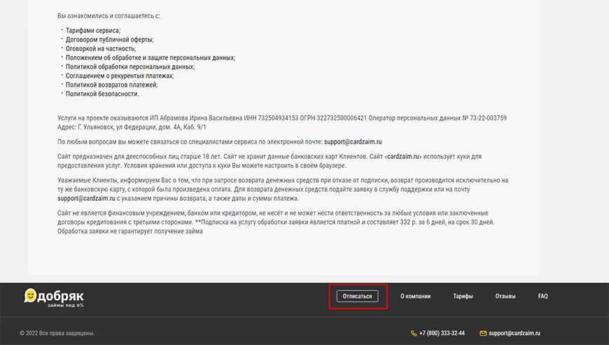 Отписаться от платных услуг и подписок Cardzaim (Добряк)