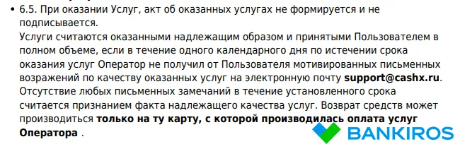 Фактически заемщик может обратиться в микрофинансовую организацию без посреднических сервисов. Кэш Икс только принимает заявки, не давая гарантий и не выступая на защите интересов потенциального заемщика. Отказаться от услуги можно в любое удобное время, используя форму на сайте компании. Для возврата денежных средств нужно написать обращение на электронный адрес фирмы в течение одного календарного дня.