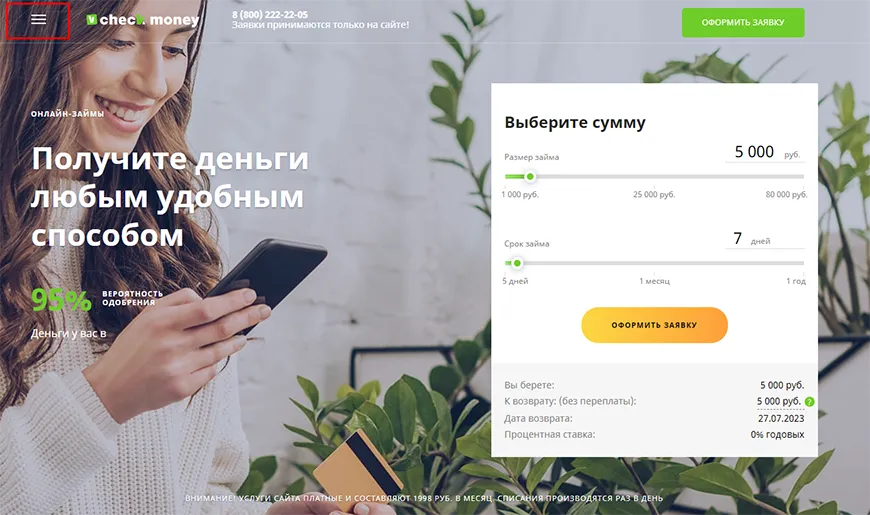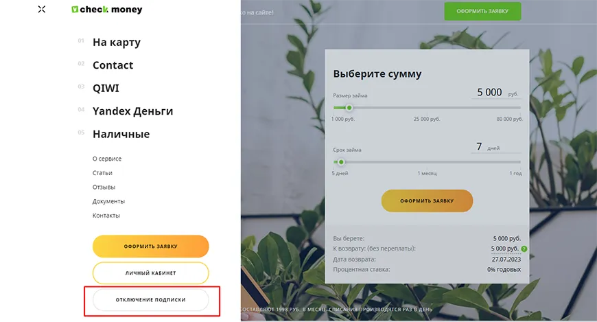 Чтобы отказаться от использования услуг, вам необходимо перейти на сайт компании. Введите название в поисковик или используйте ссылку https://checkmoney.su/.