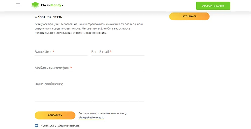 Также на сайте есть форма для обратной связи. Ее тоже можно использовать, чтобы отписаться от подписки CheckMoney. Форма размещена по ссылке https://checkmoney.su/about. При заполнении нужно указать телефон, ФИО и суть обращения. Обязательно указать е-мейл для получения ответа.