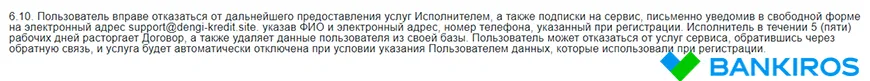 Обратите внимание, что оферта содержит прямое указание на расторжение договора по электронной почте. Не стоит игнорировать данный тезис, иначе у посредника будут основания продолжить списание. Необходимо составить письмо, указав ФИО, контактный телефон, номер карты, е-мейл. Обязательно отразить в тексте и просьбу об отключении услуги. Затем отправьте готовое письмо на электронный адрес support@dengi-kredit.site.