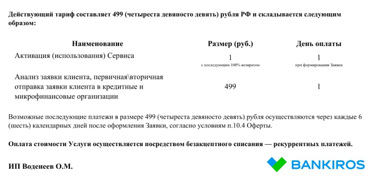 Стоимость анализа заявки составляет 499 рублей. Оплата осуществляется в автоматическом режиме с карты пользователя каждые 6 дней. Договор будет продлеваться самостоятельно, если клиент не отключит опцию на сайте или по обращению в техническую поддержку.