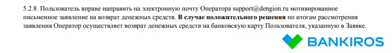 Также отключить опцию и вернуть деньги в Dengion можно через техническую поддержку сервиса. Для оформления запроса напишите обращение в свободной форме на почтовый ящик support@dengion.ru. Дополнительно предусмотрено консультирование клиентов по номеру горячей линии +7(495) 187-47-32. Обратите внимание, что вызовы в контактный центр оплачиваются по тарифу оператора связи. Сроки, в которые нужно подать обращение, не указано, но обычно аналогичные запросы рассматривают в том случае, если они поданы в течение суток после последней расходной операции.