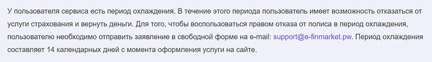 Согласно законодательству РФ возврат страховой премии осуществляется по запросу застрахованного в течение 14 дней с момента заключения договора. По истечению периода охлаждения можно отписаться от платных услуг по займам Финмаркет, но вернуть деньги невозможно. Отправить запрос в свободной форме стоит на электронный адрес support@e-finmarket.pw.