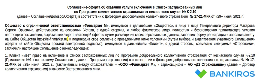 Информационный посредник не заключает договора страхования напрямую и не предоставляет микрокредиты. Компания предлагает оформить соглашение коллективного страхования. По информации на сайте договор повышает шансы на положительное решение по займу, но не гарантирует выдачу. В действительности потенциальные кредиторы редко обращают внимание на подобные списки. Лучше сразу отписаться от платных сервисов Е-финмаркет, чтобы сэкономить средства.