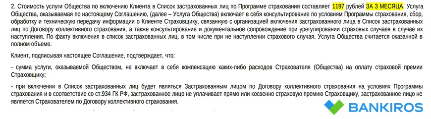 За заключение договора страхования и внесение в список застрахованных лиц нужно заплатить 1997 рублей. Если своевременно не отписаться от платных подписок Финмаркет, то сумма будет списана долями по 399 рублей за 3 платежа раз в 5 дней.