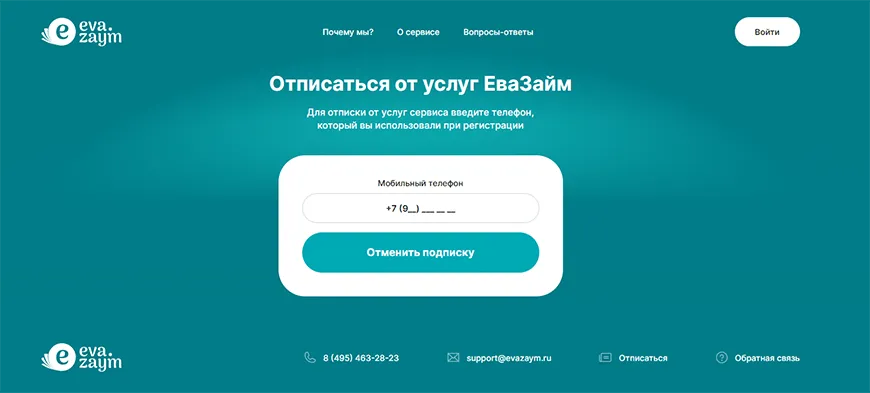 Клиент может отказаться от подписки EvaZaym, позвонив по телефону 8(495) 463-28-23. Звонок тарифицируется в зависимости от расценок оператора связи. Перед отключением сервиса специалист колл-центра должен уточнить персональные сведения. Будьте готовы предоставить паспортные данные, карты и номер телефона.