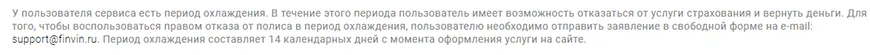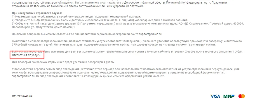 На сайте Финвин есть информация о том, что отписаться от платных услуг и вернуть деньги можно в течение 2 часов. Это не соответствует документации и действующему законодательству. На самом деле, пользователь может отправить обращение в свободной форме на электронный адрес support@finvin.ru в течение 14 дней. Этот срок называется периодом охлаждения. Далее обращаться за возвратом не имеет смысла.