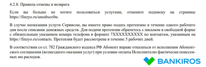 Согласно условиям оферты, возможен отказ от услуги через электронную почту. Чтобы отписаться от Finzyo и вернуть деньги, нужно отправить обращение в техническую поддержку в течение рабочего дня после списания. Претензия должна содержать полное имя, данные паспорта и контактную информацию. Адрес электронной почты компании – finzyo@supporthere.ru.
