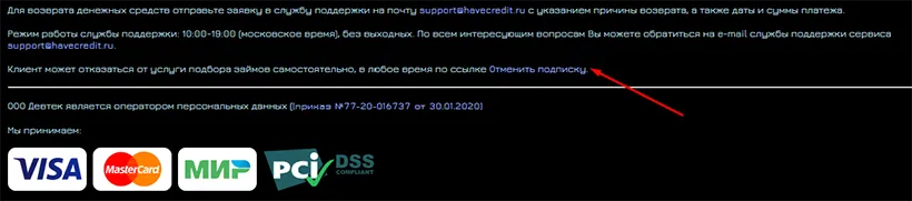 • нажать на кликабельную надпись «Отменить подписку» и перейти по ссылке https://havecredit.ru/unsubscribe;