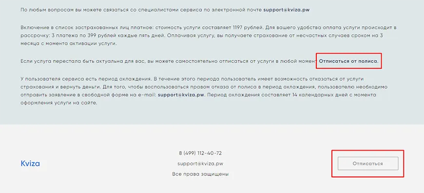 Отписаться от платных услуг Квиза можно в любое время, а вернуть списанные деньги в течение 14 дней. Такое ограничение связано с особенностями законодательства, отводящими две недели на период охлаждения по страховым сервисам. Для возврата следует составить обращение в свободной форме и послать его на электронный адрес support@kviza.pw.