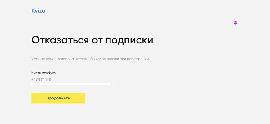 1. Зайти на страницу https://kviza.ru/unsubscribe. Это прямая ссылка на деактивацию услуги. Открыть ее можно на компьютере или смартфоне.