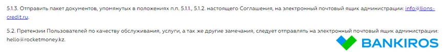 В документации посредника не отражен порядок возврата списанных средств. Отправить обращение можно на электронный адрес фирмы - info@lions-credit.ru, или администрации - hello@rocketmoney.kz.