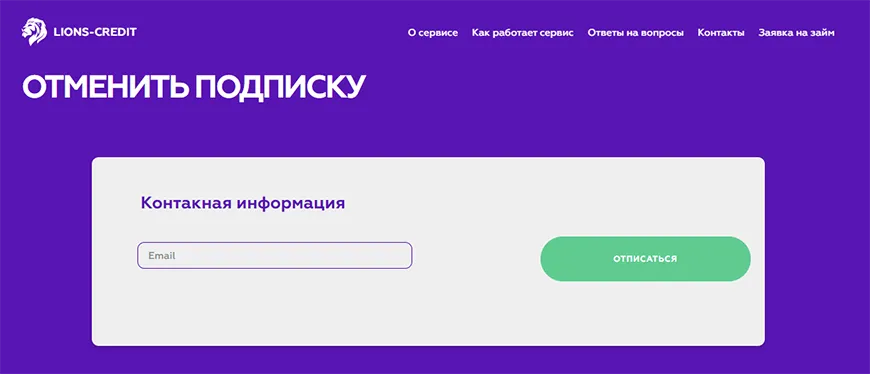 Отписаться от платных услуг Лион Кредит можно на сайте перейдя по ссылке https://lions-credit.ru/unfollow. Получить консультацию касательно процедуры деактивации можно по телефону +7(499) 450-37-29 или отправив обращение на е-мейл info@lions-credit.ru.