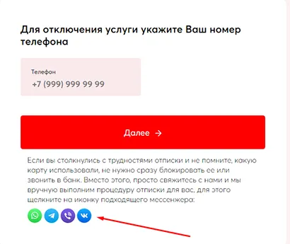 Если какие-то сведения утрачены или забыты, не обязательно сразу блокировать карту или обращаться в банк. Вместо этого можно связаться с компанией через WhatsApp, Telegram, Viber или ВК и тогда сотрудники в ручном режиме отключат от платных услуг сервиса. Для этого нужно на странице с формой нажать на иконку подходящего мессенджера.