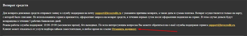 Вместе с этим, клиент вправе в любой момент отписаться от платных услуг LoveCredit и заняться поиском подходящего предложения самостоятельно.