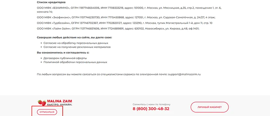 Отписаться от платных услуг MalinaZaim легко по номеру контактного центра. Он также принимает заявки 24/7. Актуальный номер телефона - 8(800) 300-48-32. Для отключения нужно сообщить оператору имя и номер мобильного.