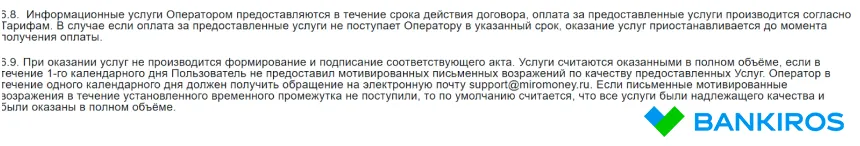 В тексте публичной оферты Miromoney сообщает, что оставляет за собой право передавать личную и контактную информацию потенциального заемщика третьи лицам. К последним относятся микрофинансовые компании и рекламные сервисы.