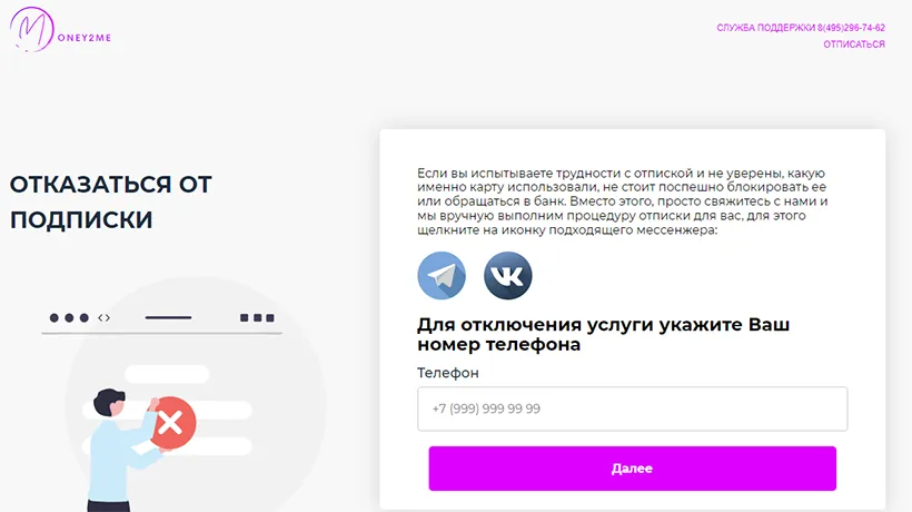На новой странице https://money2me.ru/unsubscribe нужно заполнить предложенную форму и указать номер телефона, на который осуществлялась регистрация в сервисе, а также ввести реквизиты банковской карты.