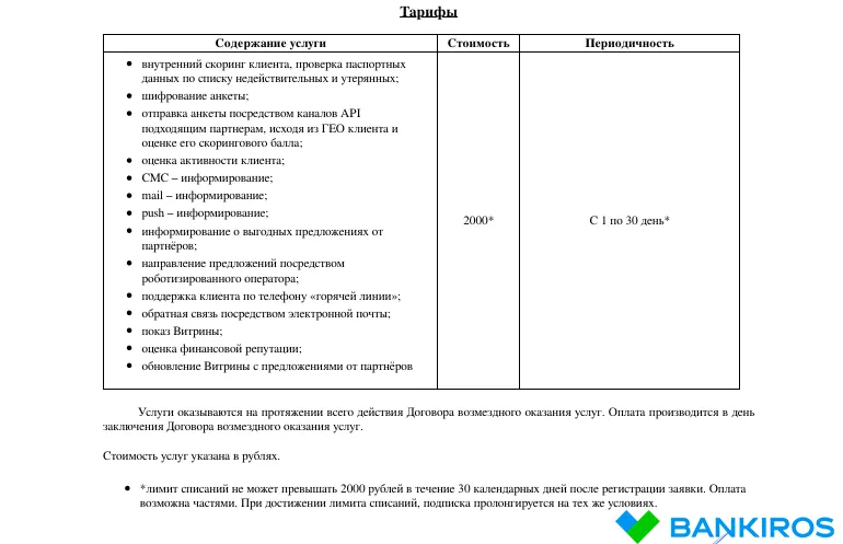 Средства за помощь в подборе займа списываются ежедневно с 1 по 30 день работы опции. Итоговая сумма перечислений в пользу информационного посредника не может превышать 2 тысяч рублей в месяц. После достижения лимита по списаниям опция будет продлена автоматически на аналогичный срок, поэтому важно отключить платную опцию самостоятельно.