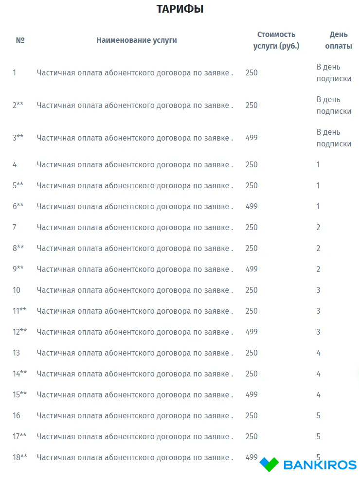 Дополнительно предусмотрены списания за формирование рейтинга – от 49 до 379 рублей, помощь в формировании заявки – 999 рублей. Если у клиента на счете нет нужного объема средств, платежи взимаются частично.