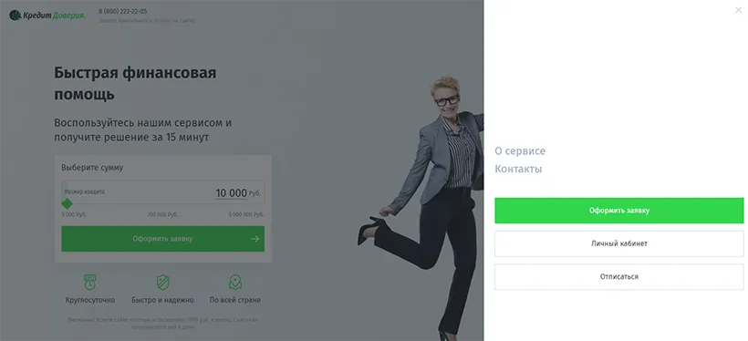Сервис Траст Кредит – посредник, позволяющий увеличить шансы получения займа за счет отправки анкетных данных в несколько МФО. Воспользоваться его услугами можно круглосуточно, независимо от того, в каком населенном пункте России проживаете. Пользователи, подключившиеся к сервису, имеют доступ к лучшим и акционным предложениям, получают выгодные варианты на постоянной основе до момента окончания действия подписки. Последняя предполагает автоматическое списание средств с карты, указанной при заполнении анкеты. В Траст Кредит отписаться от платных услуг можно, но в этом случае вы потеряете доступ к предложениям.