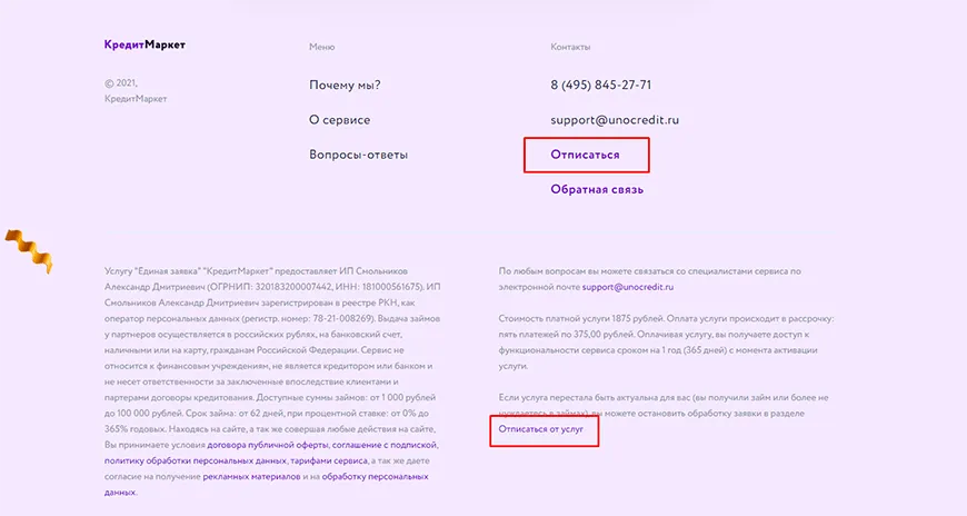 Отказаться от услуг информационного посредника UnoCredit можно по прямой ссылке https://unocredit.ru/unsubscribe, через личный кабинет или форму обратной связи. Отправить запрос можно на электронный адрес support@unocredit.ru. Обращения также принимают на горячей линии 8(495) 845-27-71.