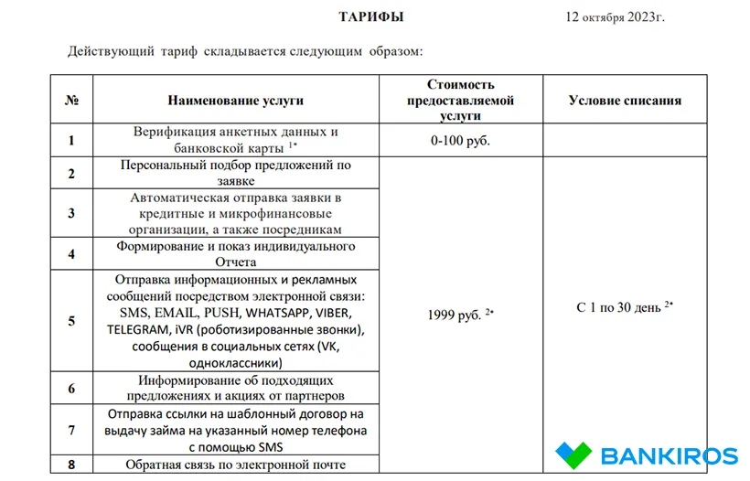 Сервис принимает заявки от потенциальных заемщиков, а далее присваивает запросу индивидуальный номер. После оценивает перечисленные сведения и отправляет анкету на рассмотрение МФО из списка партнеров. Поставщик услуги не гарантирует одобрения и не может влиять на параметры договора. Дополнительно после привязки банковской карты активируются платные сервисы, среди них: