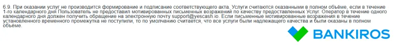 В случае несогласия со списанием денежных средств клиент может запросить возврат суммы в течение суток с момента транзакции. Для этого потребуется составить обращение с указанием личных данных: ФИО, номера телефона, реквизитов банковской карты и указать причину обращения. Далее нужно направить запрос на электронный адрес службы поддержки support@yescash.io. В оферте указано, что компенсация осуществляется только в случае подачи мотивированных письменных возражений относительно качества услуг в строго в указанные сроки. Проконсультироваться по вопросам возврата и условиям предоставления услуги можно по телефону контактного сервиса +7(800) 222-84-53.