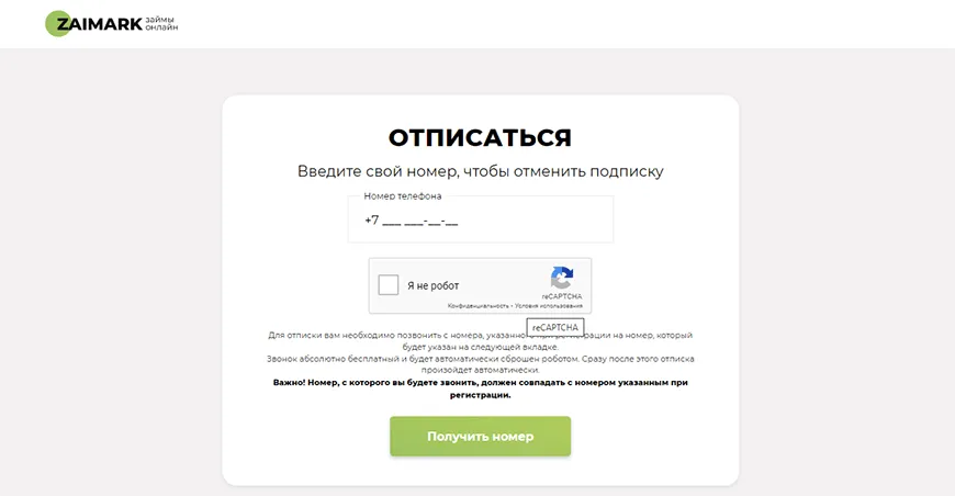 1. Найти нужную страницу. Можно использовать поисковую систему, указав в ней запрос об отписке от сервиса. Также можно перейти по прямой ссылке https://zaimark.ru/unsubscribe. В этом случае сразу будет открыта нужная страница.
