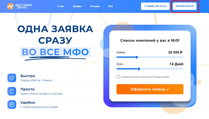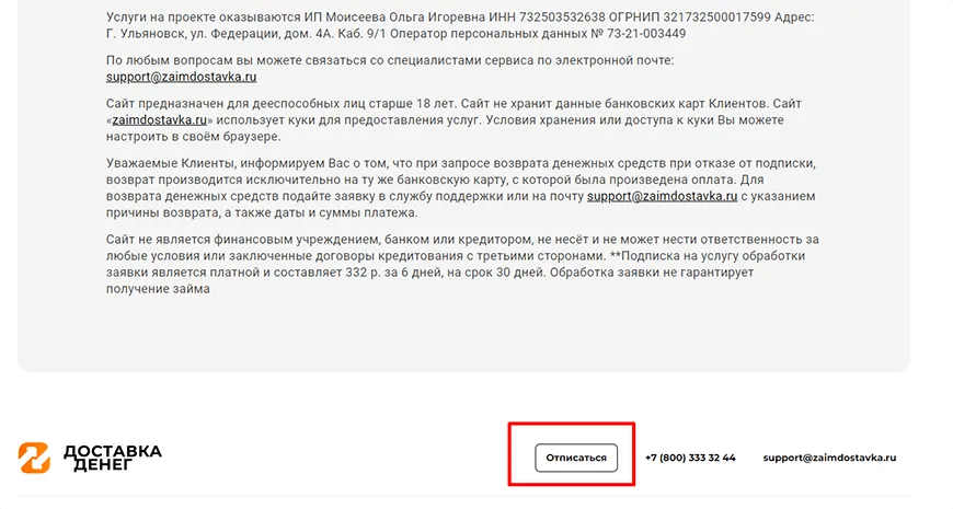Отписаться от платных подписок Доставка Денег удобно онлайн на сайте компании, поставляющей информационные услуги. Также можно обратиться в фирму по телефону +7(800) 333-32-44 или отправить запрос на support@zaimdostavka.ru.