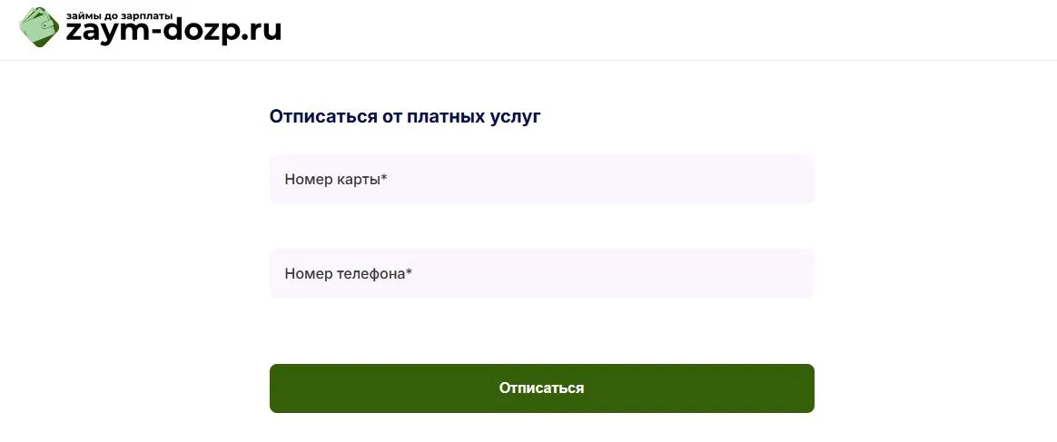 Если помощь в подборе займа не актуальна, для прекращения списаний важно оперативно отписаться от платных услуг и подписок Займы до зарплаты (Zaym dozp). Сделать это можно в любое время, независимо от даты активации. Необходимо: