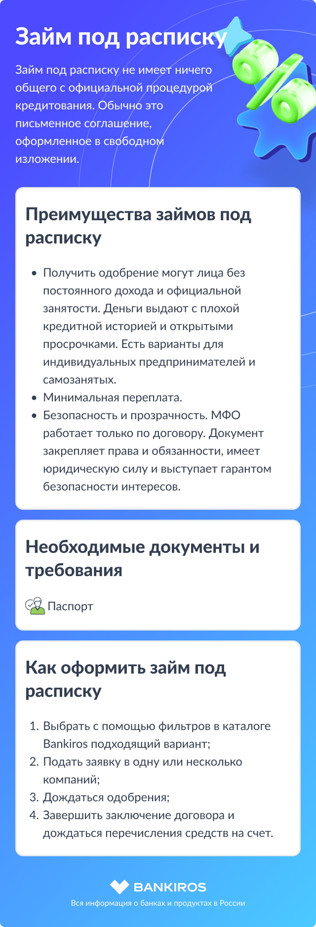 Займ в долг под расписку имеет отличную альтернативу – деньги можно взять в микрофинансовой организации. Среди плюсов обращения в МФО стоит отметить:
